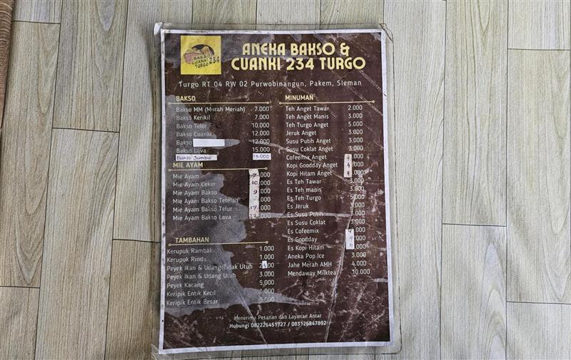Bakso Cuanki 234 Turgo menyediakan berbagai opsi menu seperti mie ayam, cuanki, bakso jumbo, bakso tetelan, bakso lava dan lain sebagainya. Selain itu, terdapat kopi Turgo dengan cita rasa yang khas.